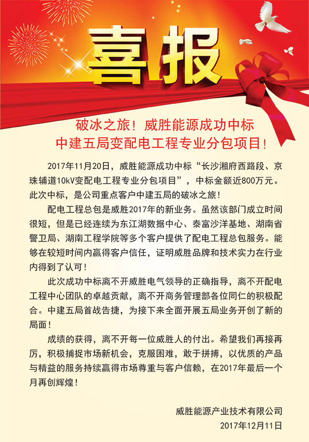 2017年11月20日,惟遠(yuǎn)能源成功中標(biāo)“長沙湘府西路段、京珠輔道10kV變配電工程專業(yè)分包項(xiàng)目”,中標(biāo)金額近800萬元。此次中標(biāo),是公司重點(diǎn)客戶中建五局的破冰之旅!