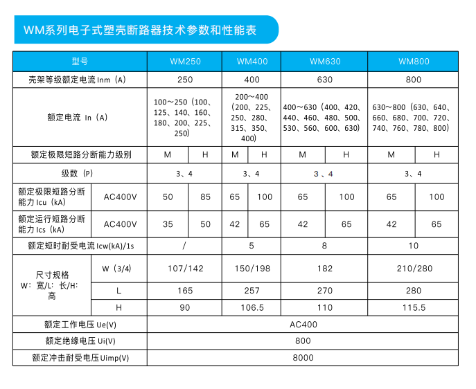 其額定工作電壓至690V、額定絕緣電壓至800V、額定沖擊耐受電壓達(dá)到BKV、額定工作電流16A-800A。WM系列斷路器適用于配電和電動(dòng)機(jī)保護(hù)場(chǎng)合,也適用于消防場(chǎng)合。斷路器具有過(guò)載、短路、欠壓保護(hù)等功能,能保護(hù)線路和電源設(shè)備不受損壞。