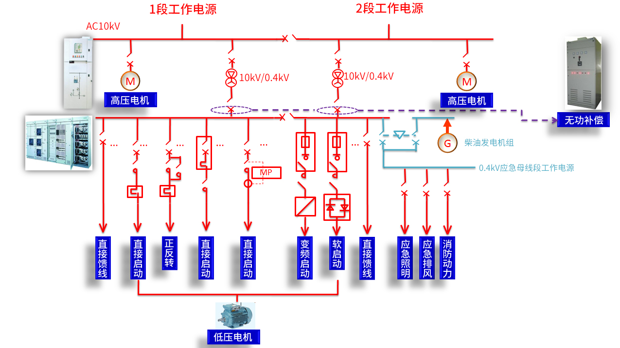 威勝電氣廠礦企業(yè)配電系統(tǒng)解決方案特別針對國內廠礦企業(yè)中低壓10KV/0.4KV配電系統(tǒng)。一個雙回路電源進線的高壓10KV配電所,正常供電時,分段隔離開關斷開,兩段母線分別車間變電所供電。在兩端母線上都皆有電壓互感器和避雷器,用于計量和防雷保護。低壓母線上接有補償無功功率的電容器,以提高工廠功率因數(shù)。廠礦企業(yè)配電解決方案根據(jù)電源以及電能輸送、分配、控制等一次設備之間的關系可供設備包含10KV開關柜、0.4KV開關柜及其配套相關配電設備。