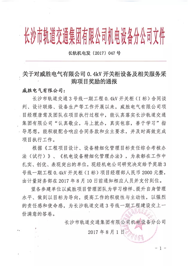 2017年8月1日,威勝電氣還受到長(zhǎng)沙市軌道交通集團(tuán)有限公司獎(jiǎng)勵(lì)通報(bào),這也是自長(zhǎng)沙地鐵開(kāi)始建設(shè)以來(lái),我公司是第一個(gè)得到公開(kāi)獎(jiǎng)勵(lì)通報(bào)的設(shè)備廠家。