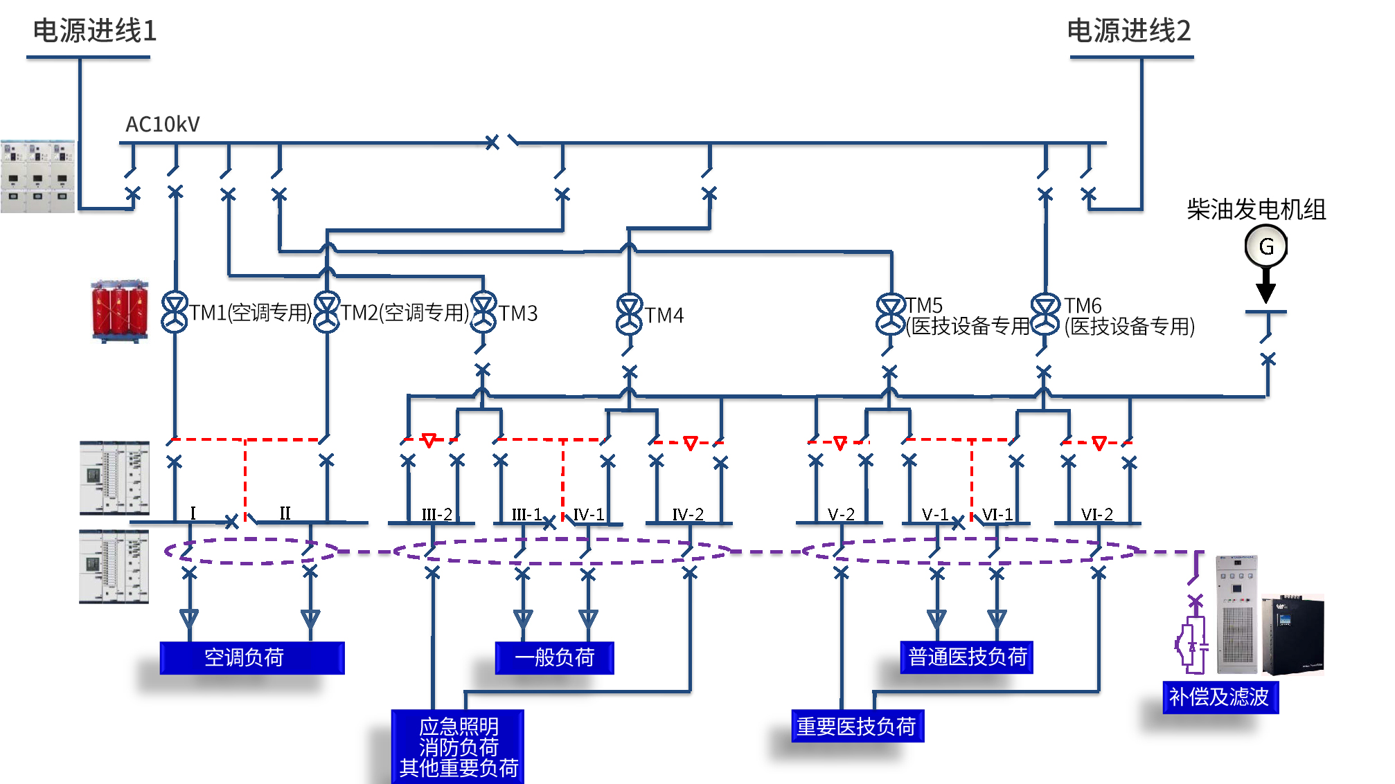 根據(jù)醫(yī)院配電系統(tǒng)的特殊性,我司設(shè)計了高可靠性、高安全性的配電系統(tǒng)。中低壓配電開關(guān)柜可選用施耐德或西門子授權(quán)柜;特殊醫(yī)療場所,如手術(shù)區(qū)等,可選用高可靠性的雙電源切換箱;針對精密醫(yī)療設(shè)備,對電能質(zhì)量要求特別高的場合,可選用具有完美濾波功能的壁掛式有源濾波裝置,節(jié)省占用空間,也方便后期改造擴容。
