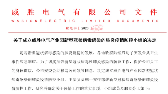 自疫情發(fā)生以來,威勝電氣成立以公司董事長為領導組組長的疫情防控小組, 健全決策高效、運轉(zhuǎn)協(xié)調(diào)的指揮體系,公司高層靠前指揮,對防控工作親自部署、督辦,多次組織召開線上防控疫情工作會議。并先后發(fā)布《關于進一步做好新型冠狀病毒感染的肺炎疫情防控工作的通知》等相關文件,對園區(qū)防疫和復工進行全面部署,對出入園管控、環(huán)境衛(wèi)生、就餐管理、考勤辦公、宣傳引導等各項防控措施進行細化并責任到人。