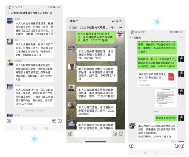 復工前,公司分別與部門經(jīng)理及高管、勞務派遣公司簽訂防疫管理責任承諾書,落實防疫期間防護措施及管理責任,與員工網(wǎng)簽復工承諾函,督促員工注意自身防護,如有異常及時匯報。