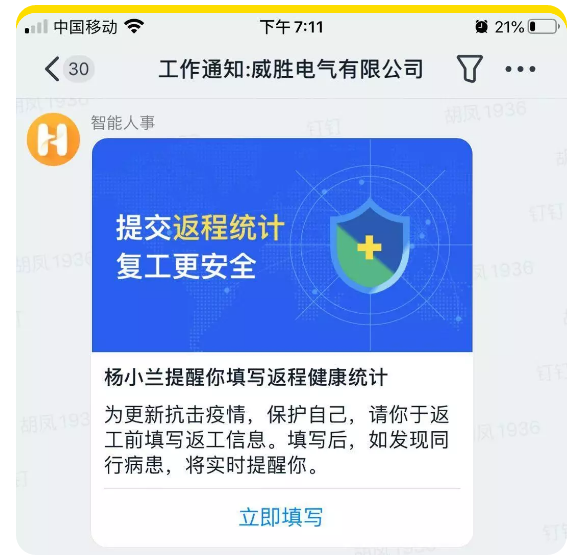 通過釘釘、微信群、電話等方式進行日報備、日監(jiān)測、日排查,落實員工情況監(jiān)測、更新員工動態(tài)與報備員工異常情況,凡14天內(nèi)由湖北返回的和與確診病人、疑似病例的密切接觸者,實施必要自我居家隔離措施。
