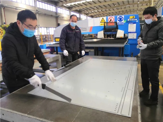要完成任務(wù),主要有兩大困難:一是需要緊急調(diào)配相關(guān)生產(chǎn)配套,尤其是如何在最短時(shí)間內(nèi)協(xié)調(diào)核心元器件各項(xiàng)物料到位,實(shí)現(xiàn)有序銜接;二是在于如何在短時(shí)間內(nèi)切實(shí)保障產(chǎn)品質(zhì)量,做到生產(chǎn)的高效、精準(zhǔn)。接到任務(wù)的第一時(shí)間,智能電氣成套事業(yè)部總經(jīng)理黃水庚和技術(shù)部、生產(chǎn)部相關(guān)人員商討電氣產(chǎn)品方案,憑借標(biāo)準(zhǔn)化圖紙?jiān)O(shè)計(jì),完成圖紙繪制與技術(shù)資料下達(dá)工作。在完成車間現(xiàn)場(chǎng)消毒后,威勝電氣一線員工迅速到崗,一切工作都在緊張而有序的進(jìn)行著。一次生產(chǎn)運(yùn)營(yíng)中心總監(jiān)朱崇明全面部署生產(chǎn)、計(jì)劃、倉(cāng)儲(chǔ)等交付鏈相關(guān)部門,全員武裝、全力投入生產(chǎn)。依靠高效、高質(zhì)的流水線作業(yè),目前,該2個(gè)項(xiàng)目完成了鈑金件自制、銅排設(shè)計(jì)、銅排制作等工序內(nèi)容。