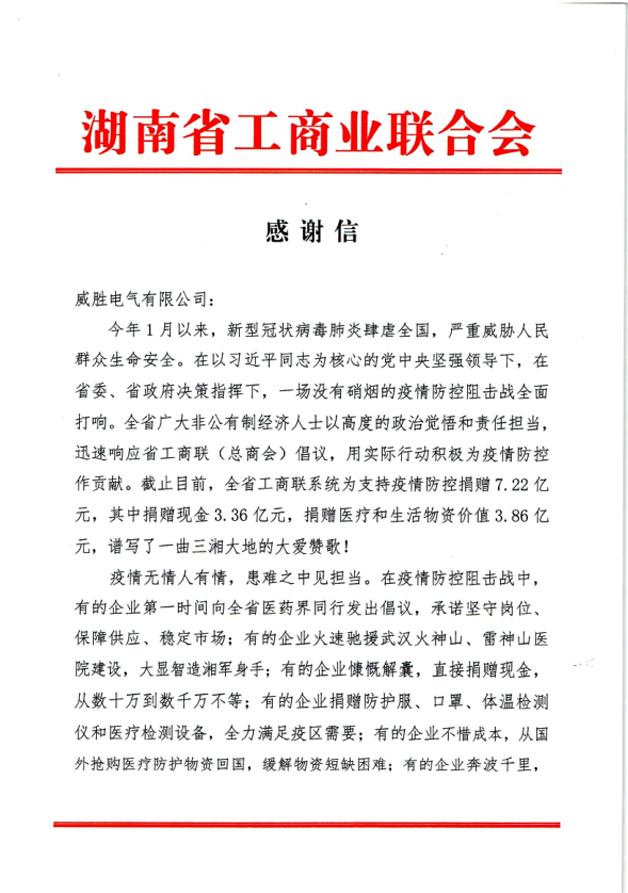 近期,威勝電氣先后收到來自中共湖南省委、湖南省人民政府及湖南省工商業(yè)聯(lián)合會的感謝信,信中表達(dá)了對威勝電氣在疫情期間馳援一線善舉的肯定與贊揚(yáng)。