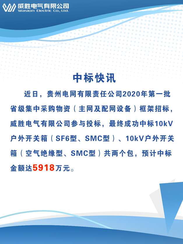 2020年4月22日,貴州電網(wǎng)有限責(zé)任公司2020年第一批省級(jí)集中采購(gòu)物資(主網(wǎng)及配網(wǎng)設(shè)備)框架招標(biāo),威勝電氣有限公司參與投標(biāo),最終中標(biāo)10kV戶外開關(guān)箱(SF6型、SMC型)、10kV戶外開關(guān)箱(空氣絕緣型、SMC型),預(yù)計(jì)中標(biāo)金額達(dá)5918萬(wàn)元。