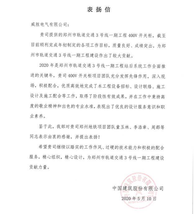 2020年5月10日,威勝電氣收到了鄭州市軌道交通項目業(yè)主方中國建筑股份有限公司發(fā)來的表揚信,感謝我司為鄭州市軌道交通3號線一期工程建設(shè)所做出的較大貢獻。