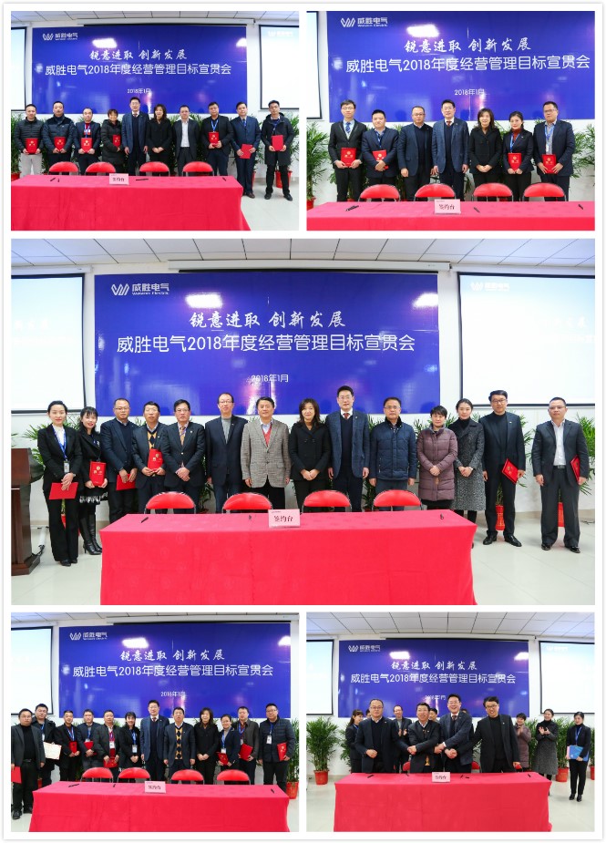 會(huì)議第二階段舉行電氣2018年經(jīng)營(yíng)管理目標(biāo)簽字儀式:首先,電氣董事長(zhǎng)曹總鄭重向控股董事會(huì)吉主席簽署2018年目標(biāo)承諾書;隨后,威勝電氣總裁曾辛先生向電氣董事長(zhǎng)曹總簽署2018年目標(biāo)承諾書;接著,由電氣經(jīng)營(yíng)管理團(tuán)隊(duì)責(zé)任人、銷售負(fù)責(zé)人簽2018年目標(biāo)承諾書。