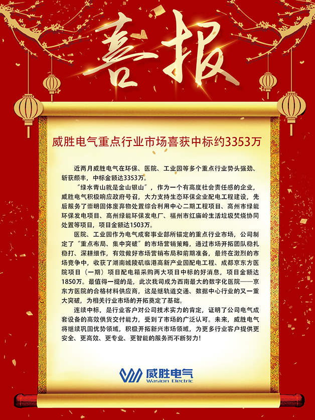 連續(xù)中標(biāo),是行業(yè)客戶對(duì)公司技術(shù)實(shí)力的肯定,證明了公司電氣成套設(shè)備的高效供貨交付能力,受到了市場(chǎng)的廣泛認(rèn)可。未來,威勝電氣將繼續(xù)鞏固優(yōu)勢(shì)領(lǐng)域,積極開拓新興市場(chǎng)領(lǐng)域,為更多行業(yè)客戶提供更安全、更高效、更專業(yè)、更智能的服務(wù)而不斷努力!