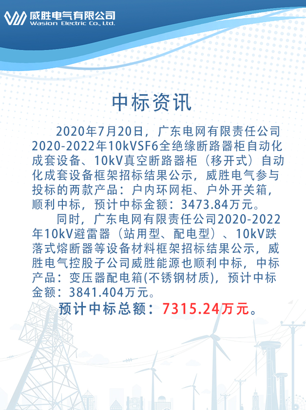 2020年7月20日,廣東電網(wǎng)有限責(zé)任公司2020-2022年10kVSF6全絕緣斷路器柜自動(dòng)化成套設(shè)備、10kV真空斷路器柜(移開式)自動(dòng)化成套設(shè)備框架招標(biāo)結(jié)果公示,威勝電氣參與投標(biāo)的兩款產(chǎn)品:戶內(nèi)環(huán)網(wǎng)柜、戶外開關(guān)箱順利中標(biāo),預(yù)計(jì)中標(biāo)金額:3473.84萬元。同時(shí),廣東電網(wǎng)有限責(zé)任公司20202022年10kV避雷器(站用型、配電型)、10kV跌落式熔斷器等設(shè)備材料框架招標(biāo)結(jié)果公示,威勝電氣控股子公司惟遠(yuǎn)能源也順利中標(biāo),中標(biāo)產(chǎn)品:變壓器配電箱(不銹鋼材質(zhì)),預(yù)計(jì)中標(biāo)金額:3841.404萬元。預(yù)計(jì)中標(biāo)總額:7315.24萬元