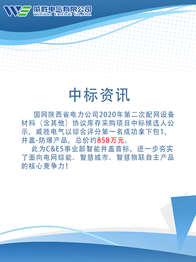 國(guó)網(wǎng)陜西省電力公司2020年第二次配網(wǎng)設(shè)備材料(含其他)協(xié)議庫(kù)存采購(gòu)項(xiàng)目中標(biāo)候選人公示,威勝電氣以綜合評(píng)分第一名成功拿下包1,井蓋-防爆產(chǎn)品,總價(jià)約858萬(wàn)元。