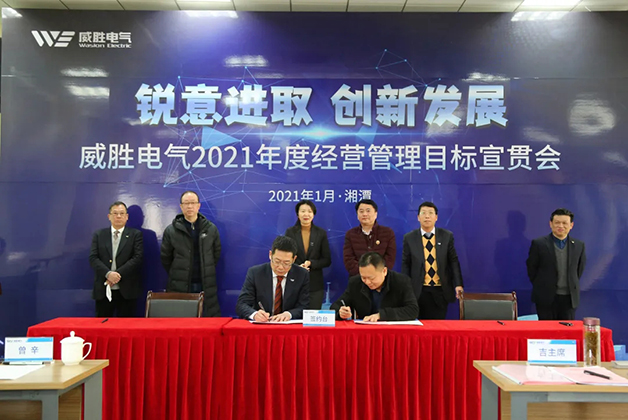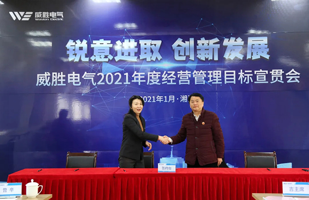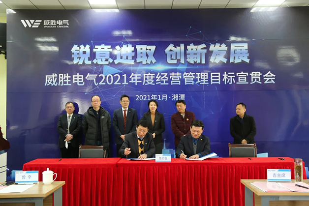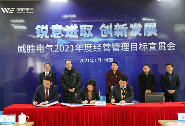 鄧超艷女士宣讀了2021年威勝電氣核心經(jīng)營管理團(tuán)隊(duì)和核心中層干部的人事任命。在控股董事會(huì)及各位領(lǐng)導(dǎo)同仁的共同見證下,電氣董事長、總裁及核心經(jīng)營管理團(tuán)隊(duì)及核心中層干部正式簽署了2021年度經(jīng)營目標(biāo)任務(wù)書。