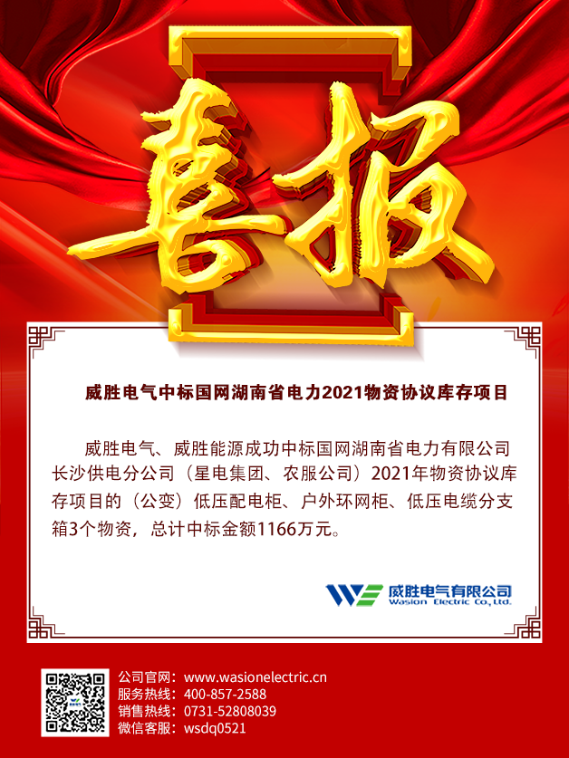 威勝電氣、惟遠(yuǎn)能源成功中標(biāo)國網(wǎng)湖南省電力有限公司長沙供電分公司(星電集團(tuán)、農(nóng)服公司)2021年物資協(xié)議庫存項目的(公變)低壓配電柜、戶外環(huán)網(wǎng)柜、低壓電纜分支箱3個物資,總計中標(biāo)金額1166萬元。