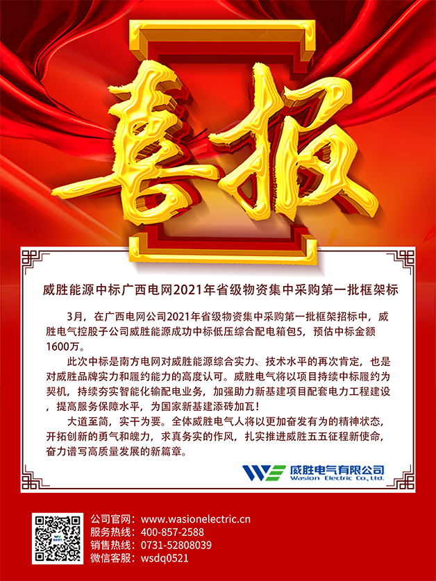 3月,在廣西電網(wǎng)公司2021年省級(jí)物資集中采購第一批框架招標(biāo)中,威勝電氣控股子公司惟遠(yuǎn)能源成功中標(biāo)低壓綜合配電箱包5,預(yù)估中標(biāo)金額1600萬。
