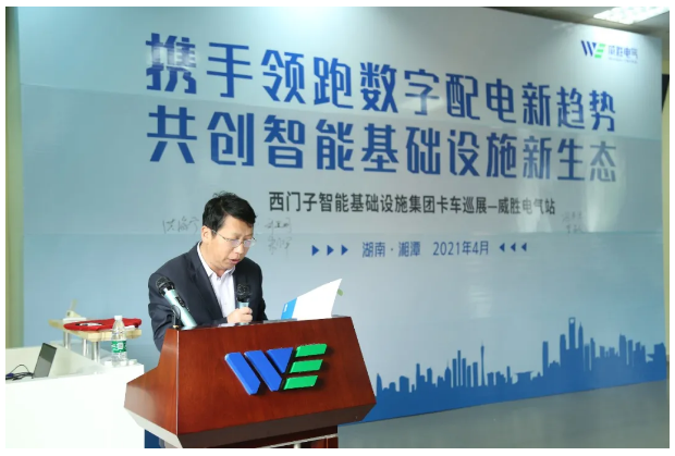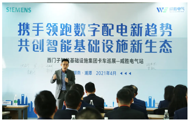 隨后西門子華中區(qū)大區(qū)經(jīng)理洪海寧先生上臺致辭,他首先表示非常高興此次西門子卡車巡展活動能在威勝電氣舉辦。威勝電氣是西門子在華中區(qū)域的重要合作伙伴,同時也作為一家有崇高理想使命的公司,現(xiàn)在已經(jīng)發(fā)展成為華中區(qū)域乃至全國知名的智能配用電領(lǐng)域的服務(wù)專家。今天西門子也借電氣智能化主題開放日這個契機,用卡車秀的形式,一方面希望把西門子智能基礎(chǔ)設(shè)施集團的先進技術(shù)帶給大家,另一方面也希望在后疫情時期加強和行業(yè)伙伴面對面溝通交流的機會。