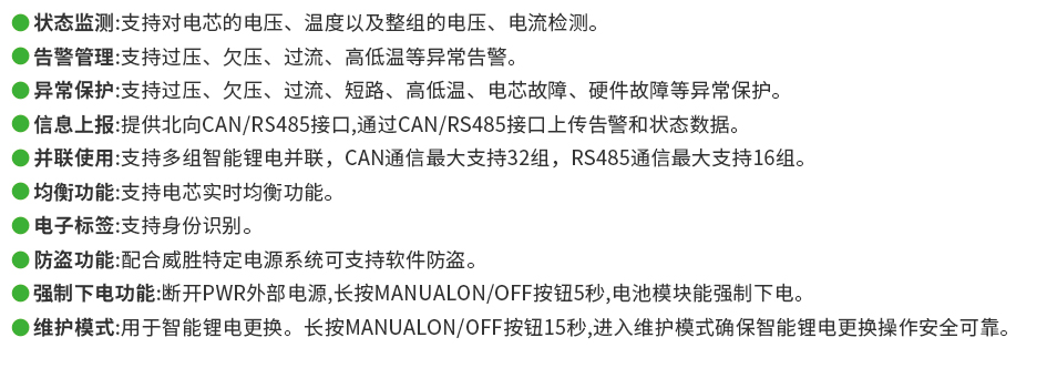 WE-ZNLD 5G基站智能鋰電是專?針對5G基站在峰?電價和儲能背景下研發(fā)的?款新型產(chǎn)品。智能鋰電是由鋰離?電池、儲能管理單元、功率及信號端?和結(jié)構(gòu)件組成的儲能單元。它不僅具備優(yōu)異的充放電特性、保障電池更?的服務(wù)壽命,更?的?放電損失,且能夠通過系統(tǒng)設(shè)置,對電池充放電時間進?控制,達到削峰填?的?的。同時,智能鋰電能夠兼容5G基站舊的鉛酸電池,同樣能夠?qū)︺U酸電池充放進?控制。