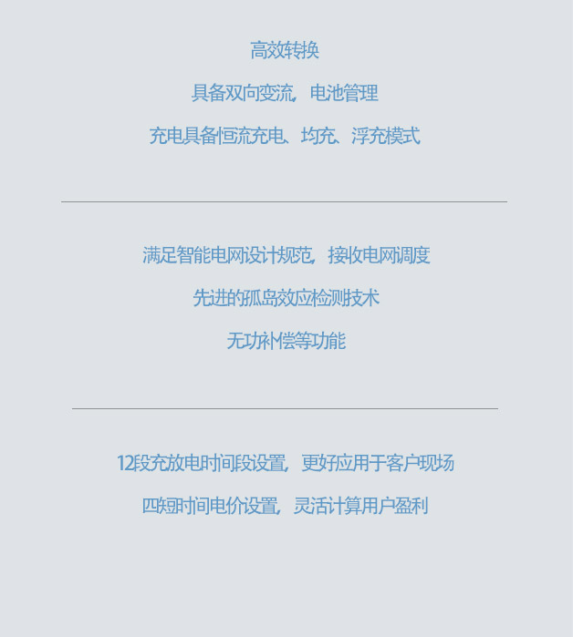 高效轉(zhuǎn)換、具備雙向變流,電池管理、充電具備恒流充電、均充、浮充模式