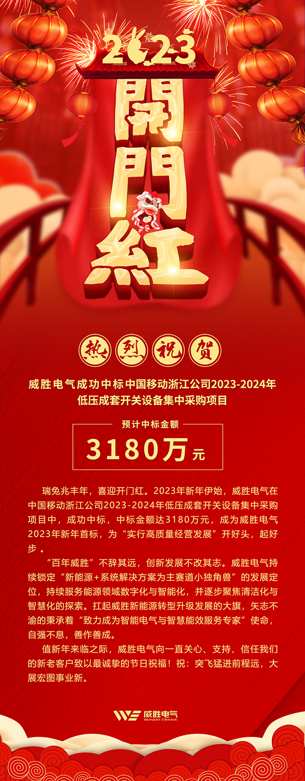 瑞兔兆豐年,喜迎開門紅。2023年新年伊始,威勝電氣在中國移動浙江公司2023-2024年低壓成套開關(guān)設(shè)備集中采購項目中,成功中標(biāo),中標(biāo)金額達(dá)3180萬元,成為威勝電氣2023年新年首標(biāo),為“實(shí)行高質(zhì)量經(jīng)營發(fā)展”開好頭,起好步 。