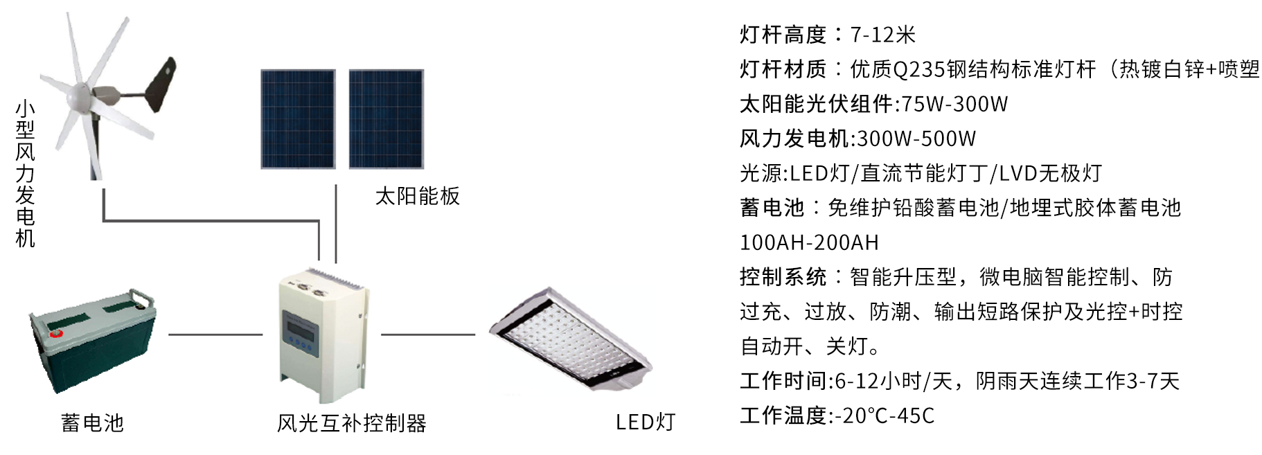 4、照明系統(tǒng):照明燈具以低壓24V燈具為主,如節(jié)能燈、無極燈、LED燈、金鹵燈等,這些燈具的不同組合的亮度可以達到普通高壓燈具照明的效果。燈具的照度、高度等一系列參數(shù)符合路燈的標準,燈具功率大小、風力發(fā)電功率、太陽能發(fā)電功率匹配協(xié)調(diào),較大程度適應(yīng)應(yīng)用地的風力資源及太陽能資源條件,且安全無觸電危險。